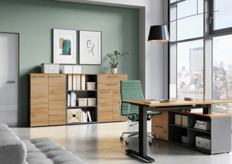 Das 45 x 120 cm große Aktenregal ISORNO in Graphitgrau/ Eiche ist die perfekte Ergänzung zum Winkelschreibtisch der Serie und bietet viel Stauraum bei wenig Platzbedarf.