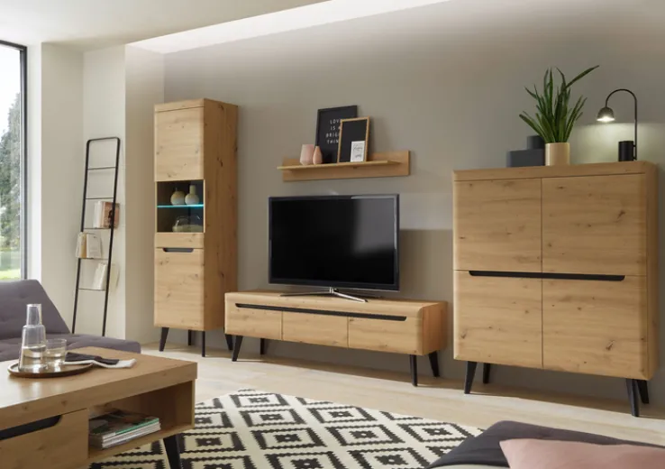 Die Wohnwand TORGE bietet eine moderne und funktionale Lösung für Ihr Wohnzimmer. Mit einer Breite von 360 cm, einer Höhe von 197 cm und einer Tiefe von 40 cm passt sie perfekt in größere Räume. Die Hauptfarbe ist Braun mit einem Dekor in Artisan Eiche und schwarzen Applikationen, was einen eleganten und zeitgemäßen Look verleiht. Das Set besteht aus vier Teilen: einer Vitrine, einem Lowboard, einem Highboard und einem Wandboard. Die Vitrine und das Highboard bieten viel Stauraum mit insgesamt fünf Drehtüren und drei Schubkästen. Das Material der Wohnwand besteht aus Holznachbildung und Klarglas, was eine pflegeleichte und langlebige Nutzung gewährleistet. Die mitteldichte Faserplatte sorgt für Stabilität und Qualität. Die schwarzen Griffe ergänzen das moderne Design und bieten einen stilvollen Kontrast zur Eichenoptik. Die Wohnwand ist ideal für Familien und ältere Personen, die Wert auf Funktionalität und ansprechendes Design legen. Mit dieser Wohnwand schaffen Sie eine harmonische und aufgeräumte Atmosphäre in Ihrem Zuhause.