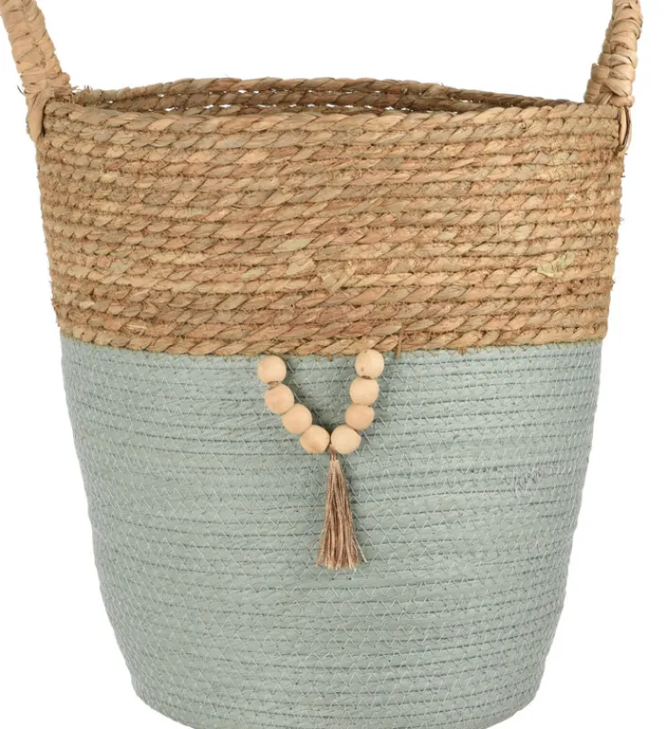 Der Aufbewahrungskorb IBIZA besitzt einen Durchmesser von 35 cm und eine Höhe von 38 cm. Er ist in den Farben Braun und Grün gehalten. Zusätzlich besitzt er 2 Tragegriffe. Der 2-farbige Korb zeigt eine Seilgeflecht Optik und eine charmante Kettenapplikation.