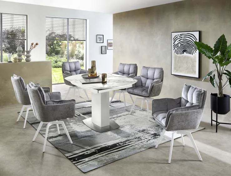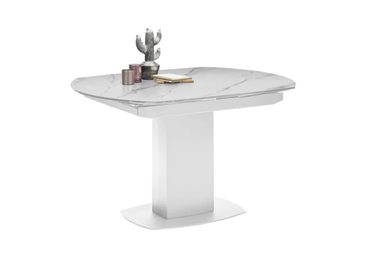 Der elegante Esstisch MICHAEL besticht mit seinem edlen Design in Weiß und Marmoroptik. Der Tisch mit dem schicken weißen Säulenfuß und der edlen Marmorplattenauflage mit den abgerundeten Kanten hat die Standardmaße 120 x 90 cm. Die Tischlänge kann durch praktischen Gestellauszug auf 180 cm verlängert werden und bietet so bis zu 8 Personen ausreichend Platz für gemeinsames Speisen oder gemütliche Spieleabende.