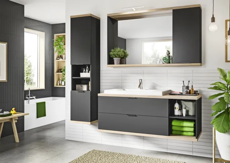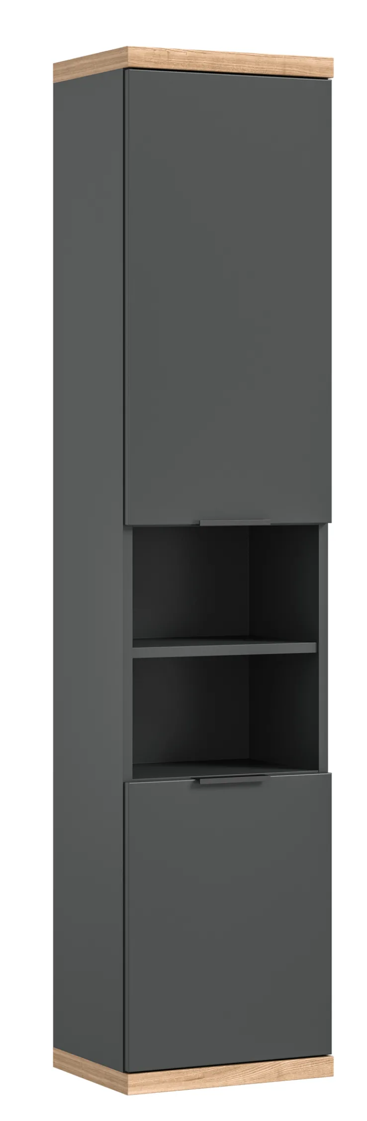Der Schrank besteht aus Holznachbildung und verfügt über zwei Türen, die einen einfachen Zugang zu den drei Einlegeböden ermöglichen. Zusätzlich bietet er zwei offene Fächer, die ideal für dekorative Elemente oder häufig genutzte Gegenstände sind. Die Kombination aus geschlossenen und offenen Bereichen sorgt für eine flexible Nutzung und passt sich den individuellen Bedürfnissen an. Der Hochschrank ist nicht nur funktional, sondern auch ein stilvolles Element, das sich nahtlos in moderne Badezimmerkonzepte einfügt.