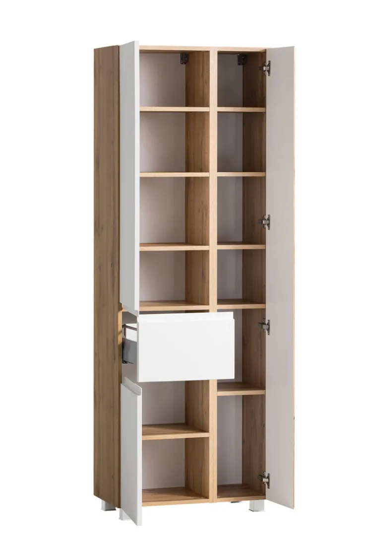 Die zwei asymmetrischen Türen lassen es vermuten: Der Bad-Hochschrank GENT bietet Aufbewahrungsfächer in verschiedener Breite. Mit acht Einlegeböden lässt sich die Höhe der Fächer variieren. Das ist ideal, um das den Stauraum zu optimieren und besonders viel unterzubringen. Gleichzeitig geben die Türen mit unterschiedlicher Breite dem Hochschrank einen modernen Look. Zu diesem Stil passt die Farbgebung in Wotaneiche-Nachbildung und Oxidbeton-Grau. Der Hochschrank lässt sich wahlweise an der Wand montieren oder auf die vier silberfarbigen Kunststofffüße stellen.