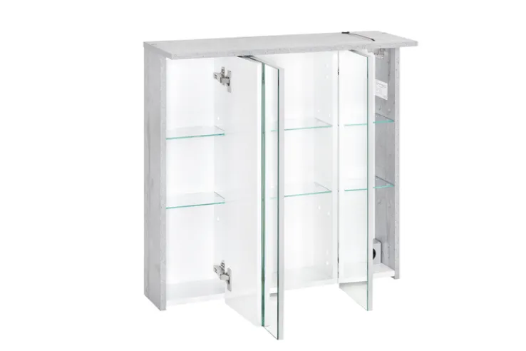 Der Spiegelschrank verfügt über drei Türen mit Soft-Close-Funktion, die ein sanftes und geräuschloses Schließen ermöglichen. Im Inneren bieten sechs Einlegeböden ausreichend Stauraum für Ihre Badutensilien. Eine integrierte Beleuchtung sorgt für optimale Lichtverhältnisse beim täglichen Gebrauch. Der Schrank ist aus Spanplatte gefertigt und überzeugt durch seine robuste Bauweise. Dieses Möbelstück vereint Funktionalität und modernes Design und ist eine ideale Ergänzung für jedes Badezimmer.