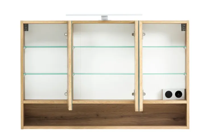Der wunderschöne Spiegelschrank verfügt über insgesamt drei Türen und sechs Glaseinlegeböden. Er ist 64 cm hoch und hat eine Tiefe von 20 cm. Idealerweise über dem Waschtisch platziert, sorgt ANTWERPEN dafür, dass benötigte Beauty- und Pflegeutensilien jederzeit griffbereit sind. Beim täglichen Styling sind die Spiegel zudem eine wertvolle Unterstützung. Hergestellt wurde der genauso praktische wie hochwertige Ordnungshelfer in Holz-Nachbildung (Wotaneiche) und aus Glas. Die Verarbeitung ist qualitativ anspruchsvoll und robust. Ein schicker Mittelpunkt für jedes Bad!