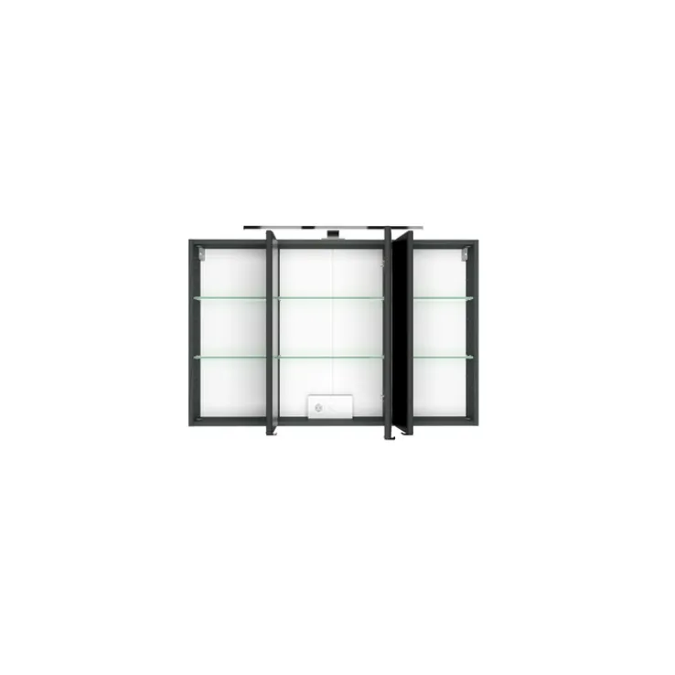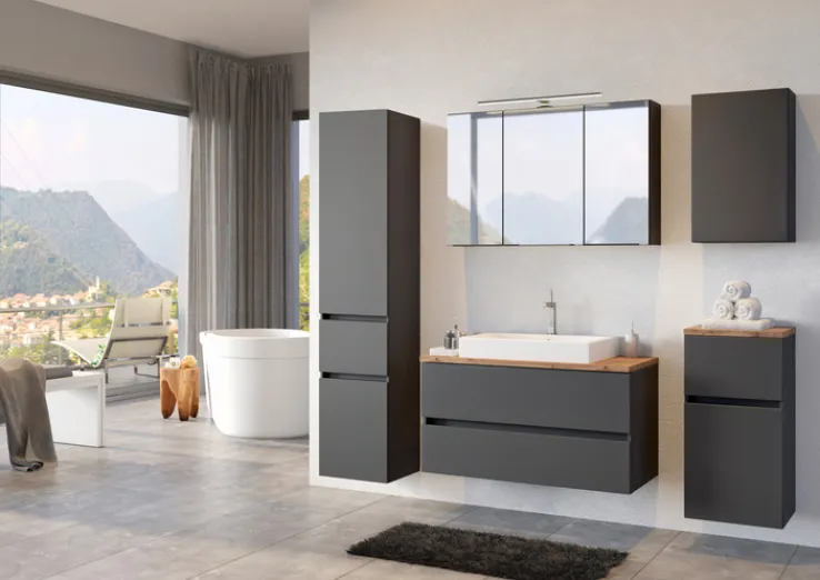 Der graue Bad-Spiegelschrank BREGENZ macht der Unordnung im Badezimmer endlich ein Ende, denn mit einer Breite von 100 cm und einer Höhe von 64 cm bietet er viel Stauraum. Geliefert wird er inklusive einer LED-Aufbauleuchte in Schwarz.