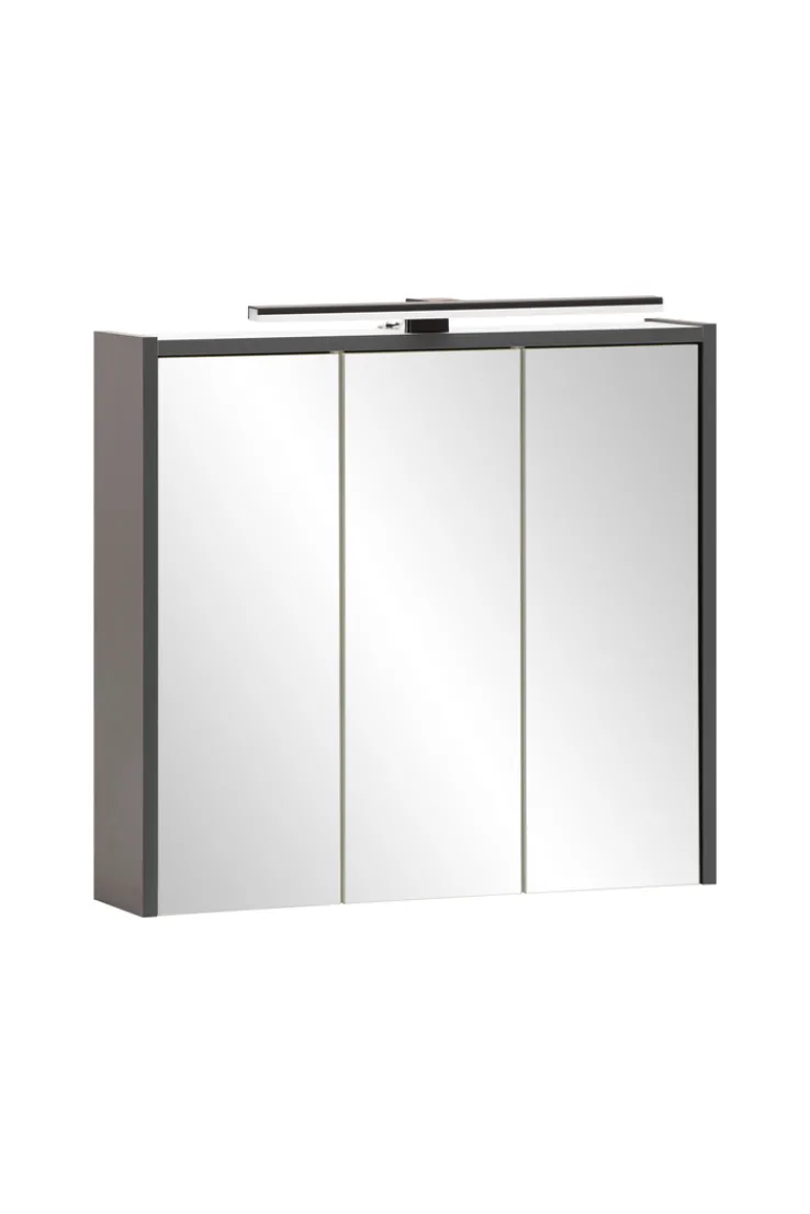 Der Bad Spiegelschrank aus der Serie PALERMO verfügt über eine Breite von 65 cm, eine Höhe von 62,7 cm und eine Tiefe von 16 cm. Die Front des Schranks besteht aus drei Spiegeltüren, die eine großzügige Spiegelfläche bieten und für eine klare, reflexionsfreie Ansicht sorgen. Der Korpus ist in einem dunklen Anthrazit gehalten, was einen modernen und kontrastreichen Akzent im Badezimmer setzt.