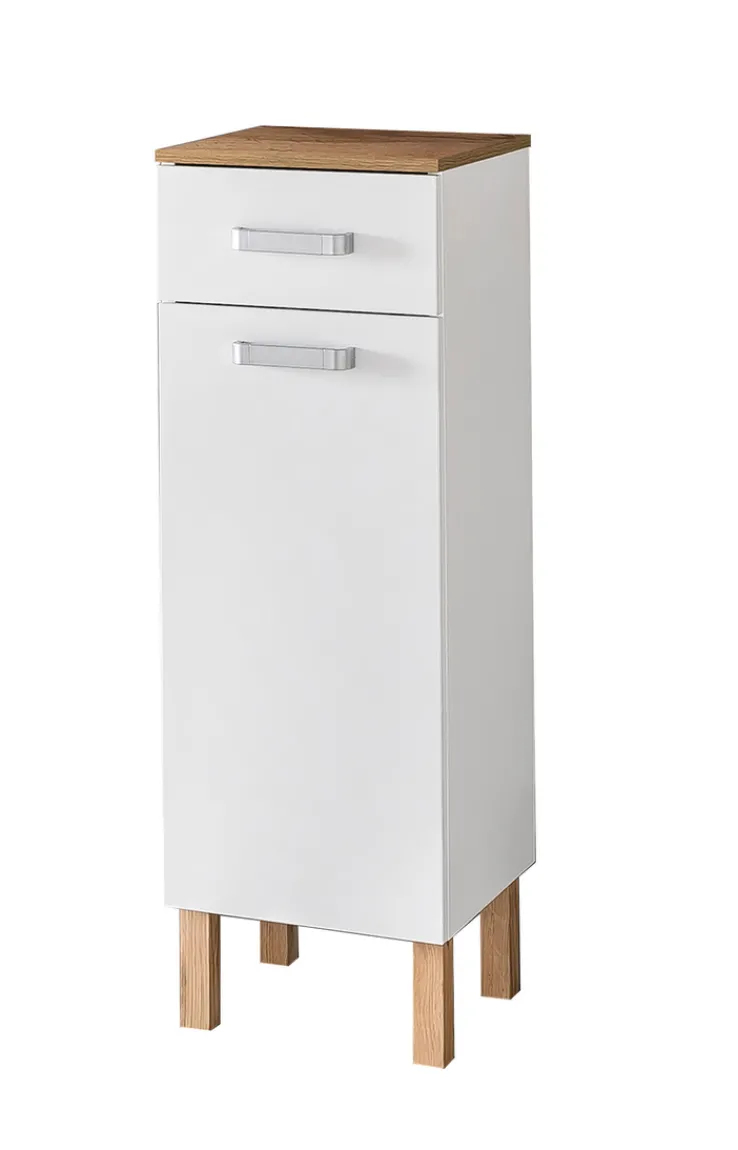 Der moderne Bad-Unterschrank bietet eine stilvolle und praktische Lösung für Ihr Badezimmer. Mit einer Breite von 32,7 cm, einer Höhe von 88,4 cm und einer Tiefe von 35,3 cm passt er perfekt in kleinere Räume. Der Schrank besteht aus einer hochwertigen Holznachbildung und präsentiert sich in einem eleganten Weiß mit einer kontrastierenden braunen Oberseite, die dem Möbelstück eine warme Note verleiht.