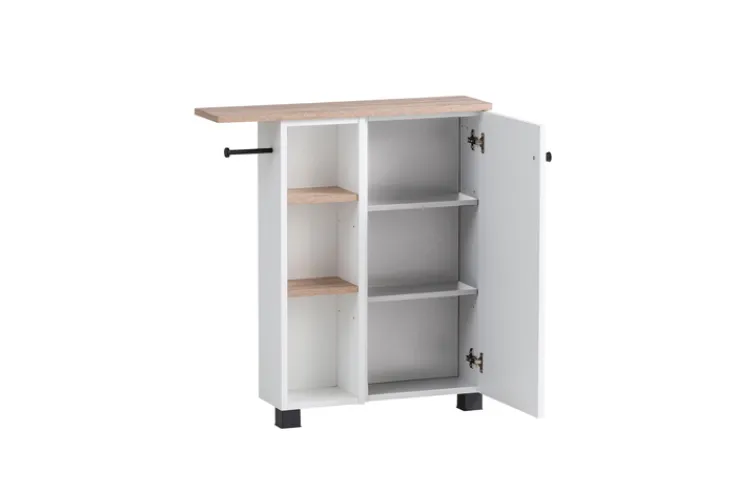 Mit seiner Tiefe von gerade einmal 17 cm, bei einer Breite von 70,7 cm und einer Höhe von 76,8 cm, ist der Bad-Unterschrank BALTO geradezu prädestiniert für kleine Bäder oder einen Platz in einer schmalen Nische. Sein Korpus ist aus weißer Holznachbildung gefertigt und mit Ablageböden in hellem Braun abgesetzt. Füße, Türknauf, Füße sowie ein praktischer Toilettenpapierhalter setzen interessante Akzente in Schwarz. Der Unterschrank verfügt über ein offenes Fach mit zwei Einlegeböden und eine Tür, hinter der sich ein weiteres Fach mit zwei Böden verbirgt. Somit bietet er großzügigen Stauraum für Handtücher, Kosmetika und vieles mehr.