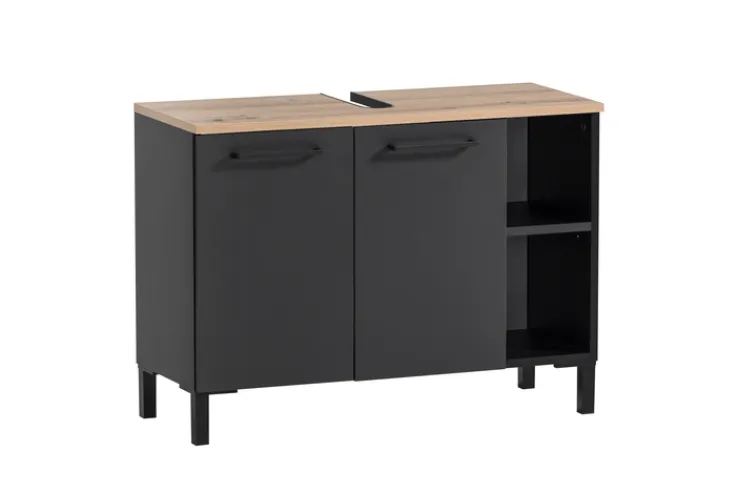 Der Waschbeckenunterschrank der Serie MALTE vereint modernes Design mit praktischer Funktionalität. Mit einer Breite von 86 cm, einer Höhe von 66,4 cm und einer Tiefe von 45 cm bietet er ausreichend Stauraum für Ihr Badezimmer. Die Hauptfarbe Schwarz verleiht dem Möbelstück eine elegante und zeitlose Optik, die durch die Holznachbildung der Oberfläche ergänzt wird. Diese Kombination aus Materialien sorgt für eine ansprechende und zugleich robuste Struktur.