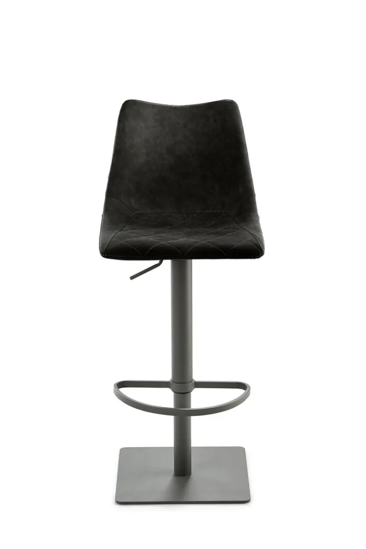 Der Bar-/Tresenhocker ist mit Kunstleder im Farbton Schwarz bezogen, welches im Vintagestil gestaltet ist. Perfekt dazu passt das graue Gestell mit einer großen Bodenplatte als Fuß, an dem Gestell befindet sich ein kleiner Tritt auf dem man bequem die Füße aufstützen kann. Um ihn perfekt auf Ihre Größe anzupassen, kann man den Hocker in der Höhe verstellen. Die Sitzschale ist zudem noch rundum drehbar um ein Blick in jede Richtung werfen zu können und bietet Ihnen mit der bequemen Rückenlehne einen perfekten Sitz an der Bar.