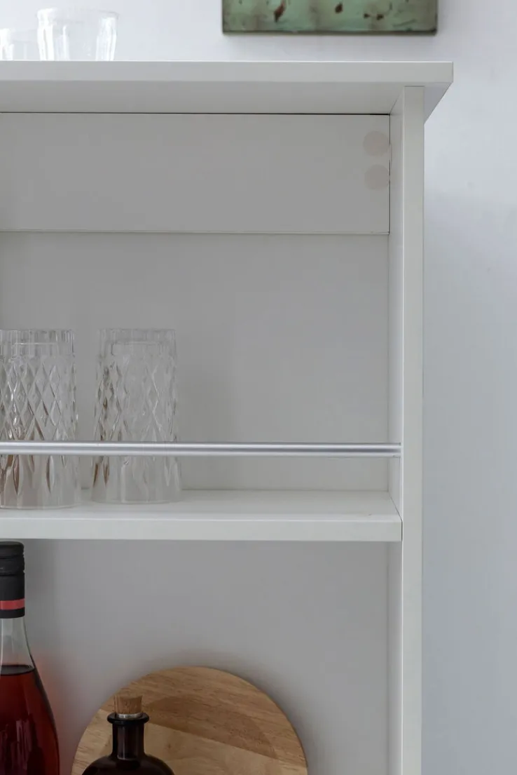 Der weiße Bartisch 120 × 60 cm ist in einer weiteren Farbe erhältlich. Das Möbelstück eignet sich als Ergänzung im Wohnbereich und bietet in drei Fächern Platz für Partyzubehör und Co.