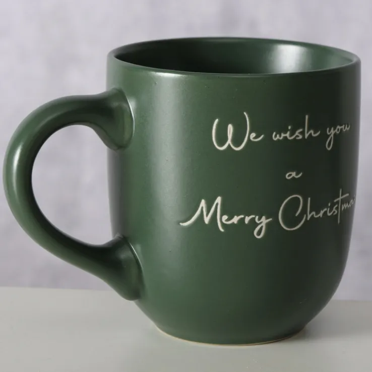Dieser Becher besteht aus grünem Steinzeug und verfügt über ein Fassungsvermögen von 300 ml. Die Oberfläche zeigt eine matte Optik und ist gleichmäßig in einem dunklen Grünton gehalten. Auf der Vorderseite befindet sich ein kontrastreicher, heller Schriftzug mit dem Text „We wish you a Merry Christmas“, der direkt in das Material eingearbeitet ist. Die Form ist rund mit einem klassischen Henkel, die Maße betragen jeweils 8,3 cm in Tiefe, Breite und Durchmesser sowie 9,5 cm in der Höhe. Der Becher ist für den Einsatz im Innenbereich geeignet und liegt durch die ergonomische Gestaltung des Henkels angenehm in der Hand. Das Material Keramik sorgt für eine robuste und langlebige Qualität. Die dezente Farbgestaltung und der saisonale Schriftzug machen diesen Becher besonders passend für festliche Anlässe in der Winterzeit.