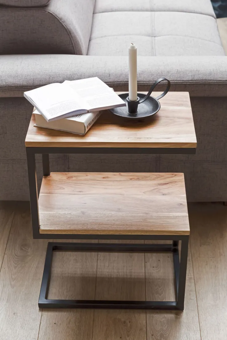 Die raffinierte S-Form und das moderne Industrial Design verleihen dem Beistelltisch eine ansprechende Optik. Das matt schwarze Gestell aus pulverbeschichtetem Eisen sorgt für eine hohe Stabilität und ergänzt sich optimal mit dem hellen Braun der beiden Tischplatten. Diese bestehen aus massivem Akazienholz und bieten ausreichend Platz für spannende Lektüre, Snacks, Getränke oder die Fernbedienung. Nicht nur im Wohnzimmer macht der 60 cm hohe Tisch eine gute Figur, auch als origineller Nachttisch oder praktische Ablage im Flur eignet er sich hervorragend.