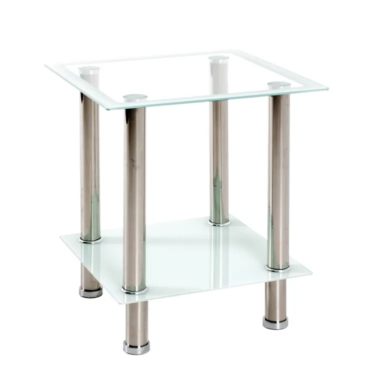 Der Beistelltisch kombiniert ein Gestell aus poliertem Edelstahl mit einer Tischplatte und einer Ablage aus 5 mm starkem Sicherheitsglas. Während die Tischplatte nur am Rand weiß lackiert ist, ist die Ablage vollständig lackiert. Mit einer Höhe von 46 cm passt das Tischchen perfekt zur Wohnzimmergarnitur. Eine gute Figur macht der Beistelltisch allerdings nicht nur im Wohnzimmer, auch in anderen Zimmern leistet er als Ablage oder Blumenhocker gute Dienste.
