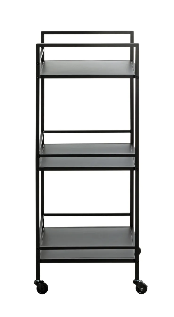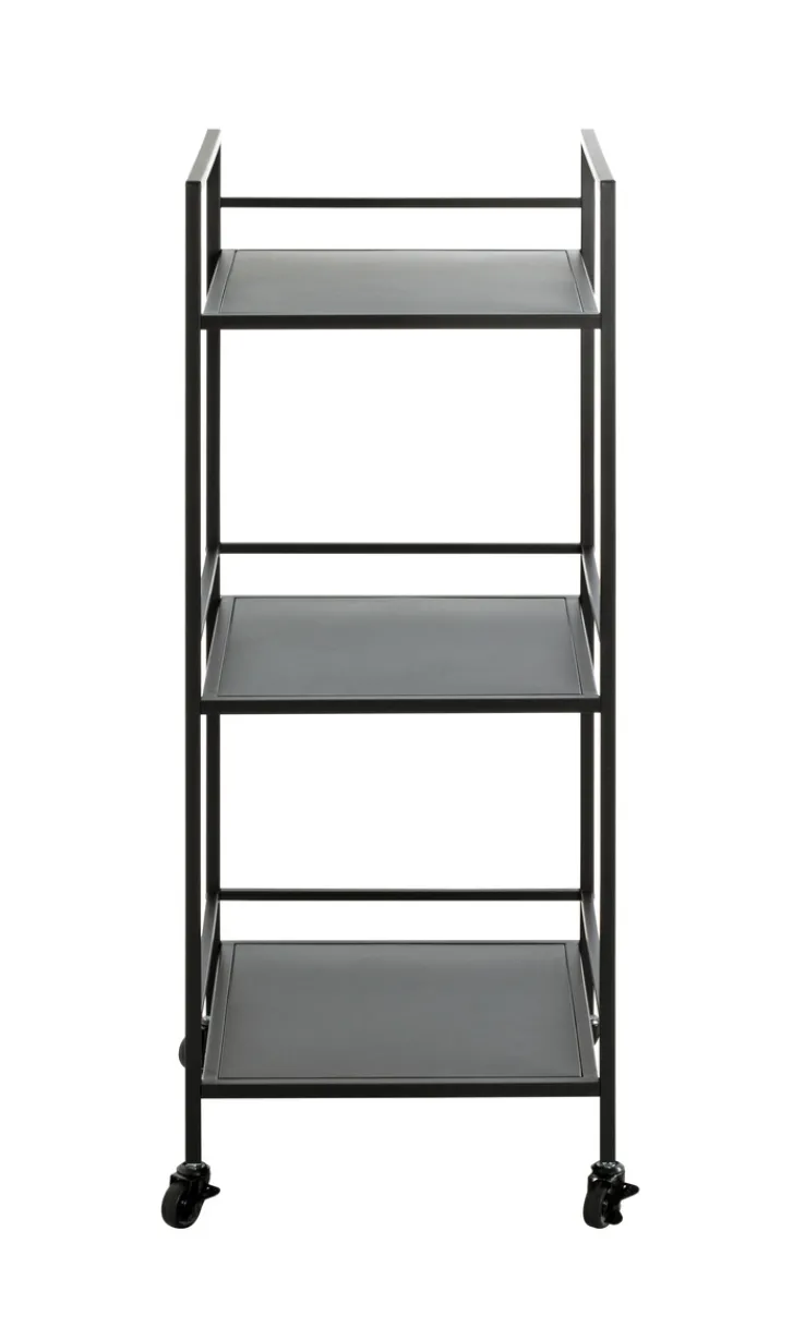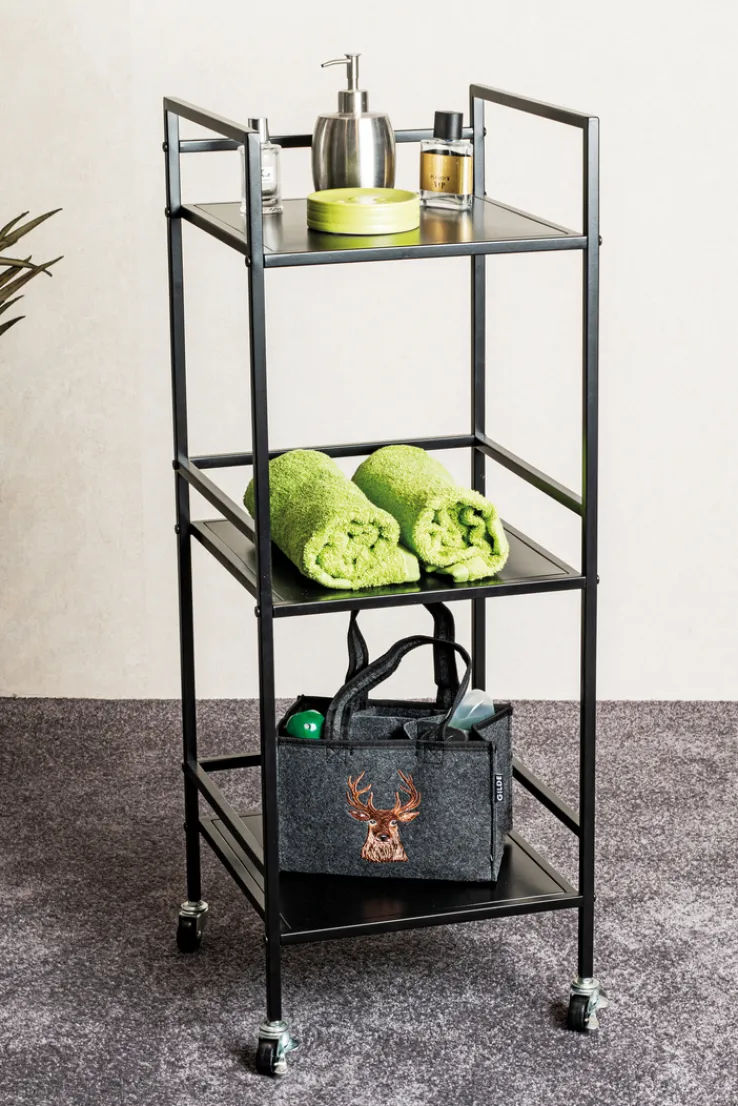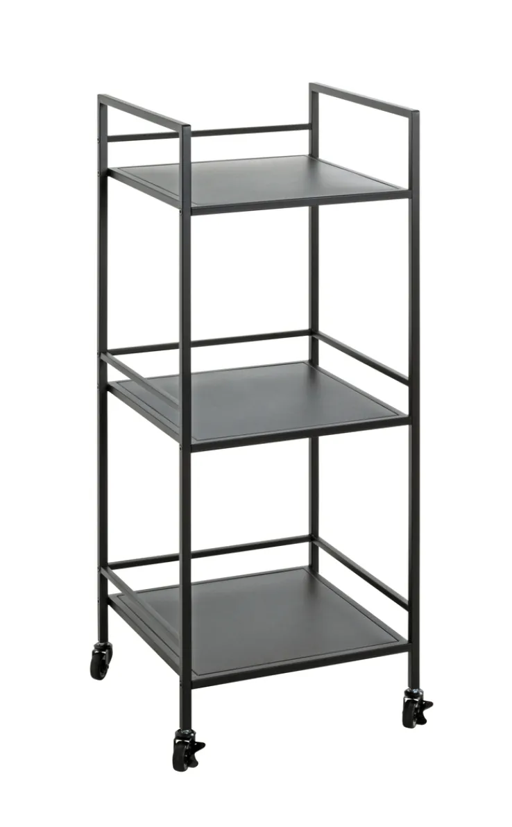 Insgesamt drei Ablageflächen bringt der schwarze Beistelltisch auf Rollen mit, die zum Beispiel als Ablage für Bücher, Magazine, Pflanzen oder diverse Deko-Artikel dienen könnten. Die gegenüber der Ablagefläche etwas höhere Umrahmung bietet dabei zusätzliche Sicherheit – insgesamt ist der Tisch so mit bis zu 8 kg Gewicht belastbar.