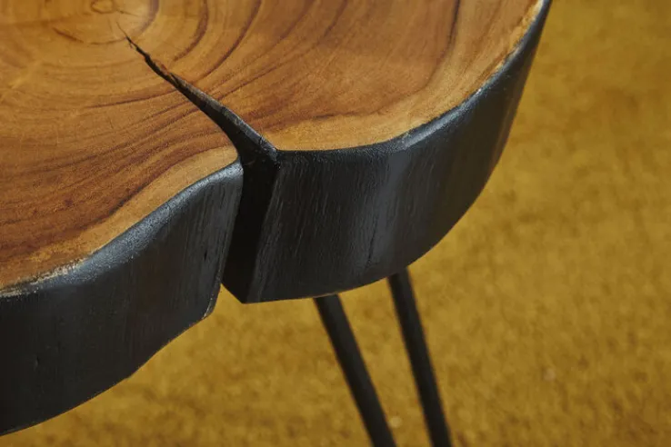 Der Beistelltisch BAGLI steht auf einem Dreifußgestell aus schwarzem Metall, das einen geschmackvollen Kontrast zu der warm wirkenden Holzoberfläche darstellt. Das außergewöhnliche Möbelstück passt gut in Einrichtungen im Landhausstil, kann aber auch in modern gestalteten Umgebungen gut zur Geltung kommen.