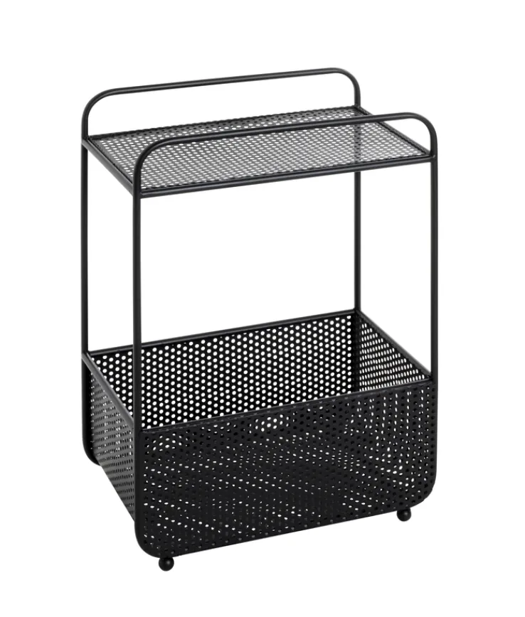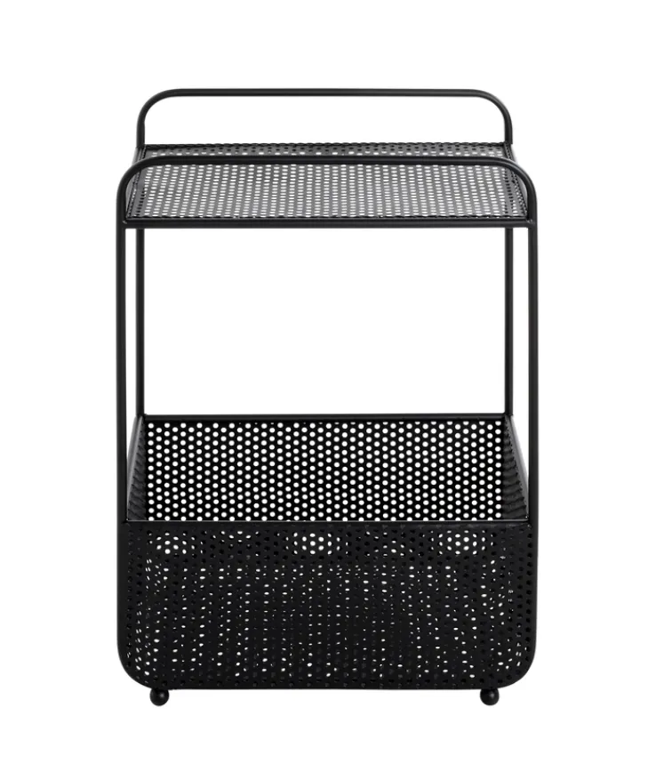 Der 58 cm hohe Beistelltisch mit Zeitungsablage besteht aus schwarz lackiertem Metall und lässt sich mit einem Gewicht von maximal 10 kg belasten. Neben der rechteckigen Tischplatte mit Lochmuster bietet er eine Zeitungsablage, die wie ein großer Korb wirkt. Der Zeitungskorb bietet viel Stauraum für Zeitungen und Magazine und verhindert mit seinen hohen Wänden, das der Lesestoff verrutscht. Auf der Ablage hält der Beistelltisch Platz für Getränke, Bücher oder Lampen parat.