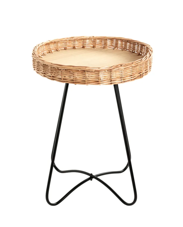 Der filigrane Beistelltisch mit 41 cm Durchmesser in Natur und Schwarz bezaubert durch seine natürlichen Materialien. Das stabile Vierfußgestell besteht aus schwarz lackiertem Metall, die Ablage aus naturbelassenem Weidengeflecht und Schichtholz.