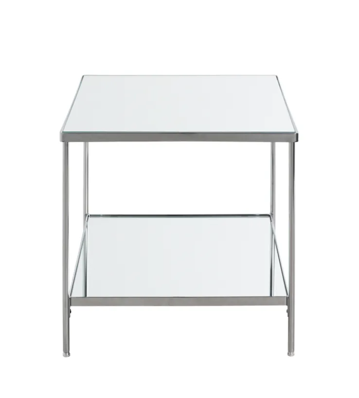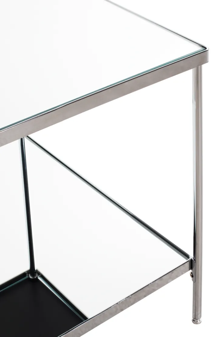 Der quadratische Beistelltisch fasziniert in der Farbe Chrom und mit den beiden Tischplatten aus robustem Spiegelglas. Das Modell mit den zwei Ablageflächen ist 45 Zentimeter breit sowie tief und 46 Zentimeter hoch, sodass die Form an einen Würfel erinnert.