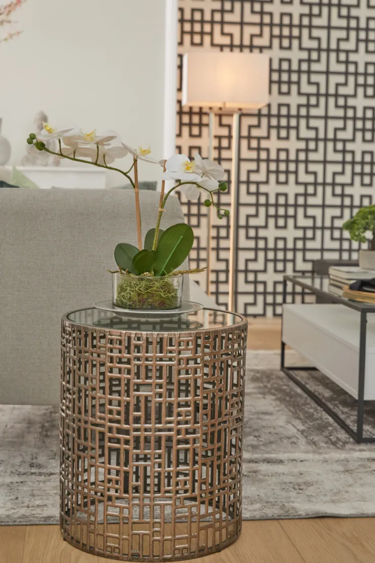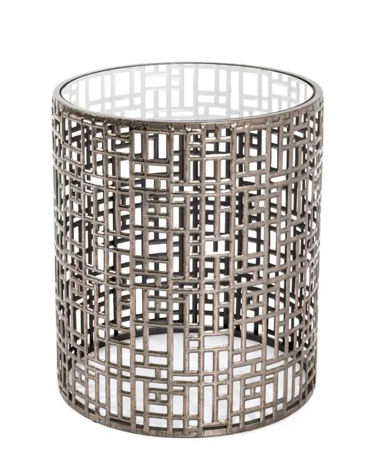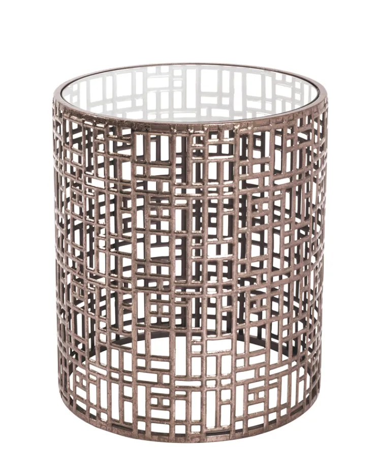 Das ausgefallene Design des Tisches zieht sicher die Blicke auf sich. Das Gestell im Farbton Antik Bronze ist vielfach durchbrochen und wird oben und unten mit je einem breiten durchlaufenden Rand aus demselben Material und in derselben Farbe gehalten. Durch diese Fassung wirkt der Beistelltisch ENZ I leicht und fast schwerelos, obwohl er aus Metall und Sicherheitsglas besteht. Der Tisch ist 45 cm hoch und damit sehr gut neben oder vor der Couch zu platzieren. Ansonsten ist ein Beistelltisch immer gefragt, auch neben Ihrem Lieblingssessel. Sie können ihn auch als Dekoration in einem Zimmer verwenden, ihn zwischen die Grünpflanzen im Wintergarten stellen oder ihn mit in Ihr Büro nehmen. Auf dem Glas des Tisches ENZ I lassen sich nicht nur Kaffeetasse und Teller abstellen, sondern ebenso eine Skulptur, eine dekorative Vase oder eine blühende Pflanze in einem schönen Blumentopf.