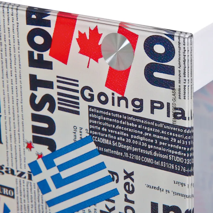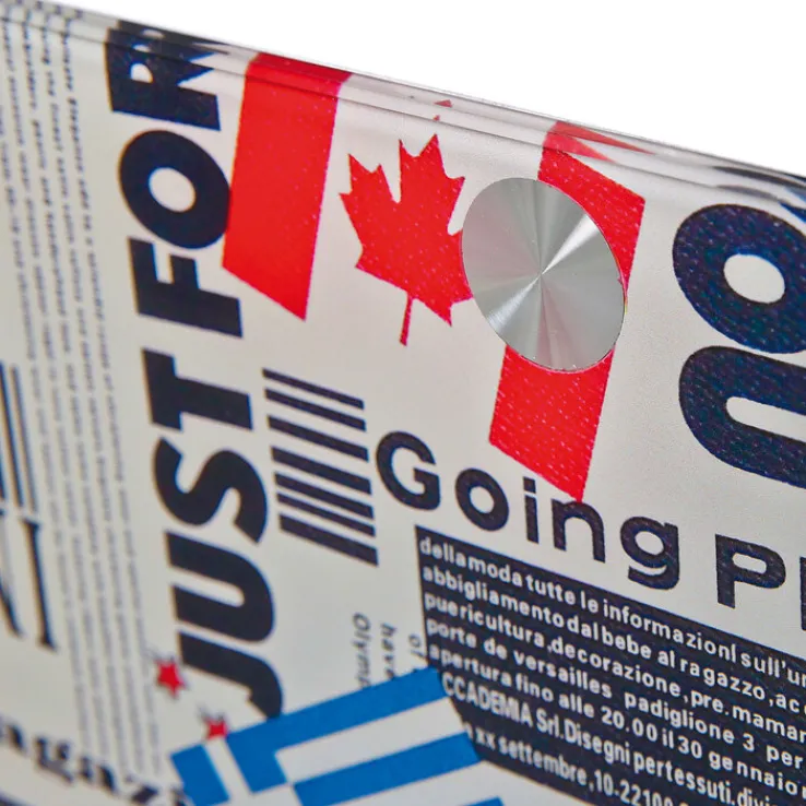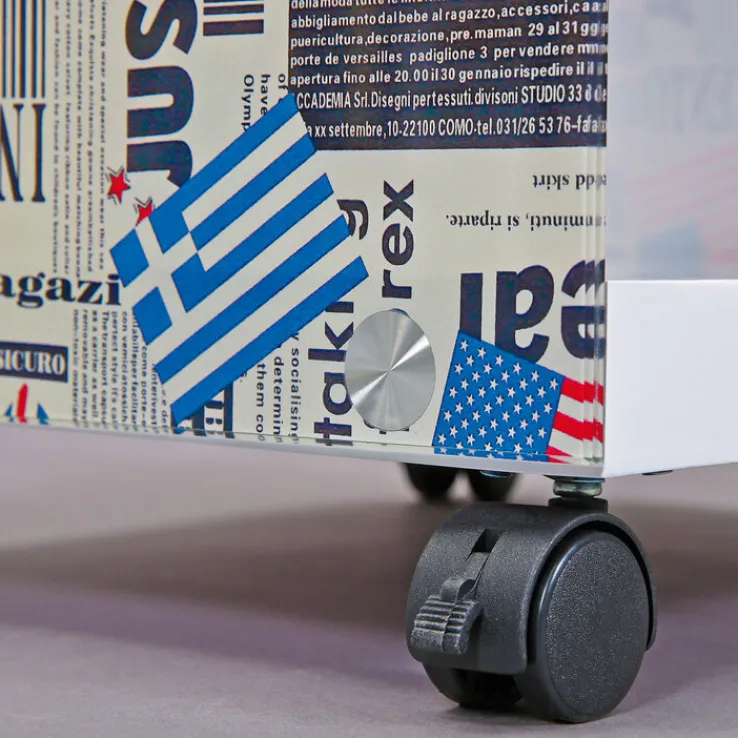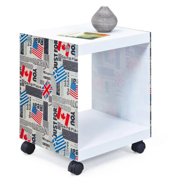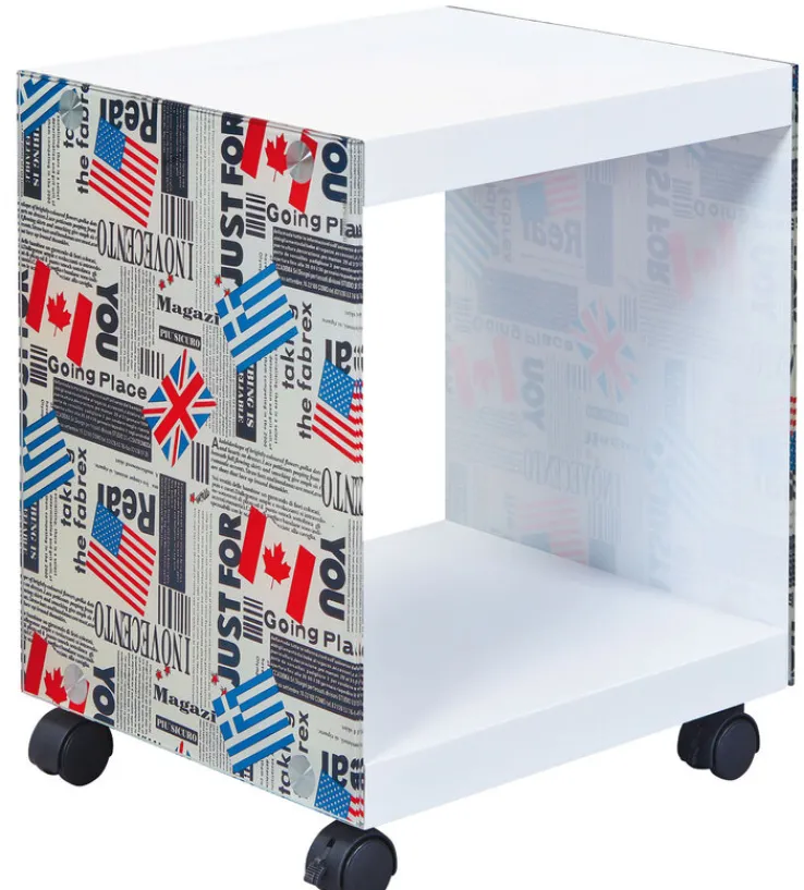 Das Design des kleinen Rolltisches TOM ist modern und jugendlich. Im Cube-Format gebaut, bilden weiß beschichtete, stabile MDF-Platten den Boden und die Tischoberseite. An den Seitenelementen aus Sicherheitsglas sind verschiedene Flaggen – Großbritannien, Kanada, USA und Griechenland – zusammen mit einem Muster aus Zeitungsdrucken aufgebracht. Der Beistelltisch im Retro-Stil ist in den Farben weiß, blau, rot und schwarz gehalten und ist ein optisches Highlight neben dem Sessel oder der Couch.