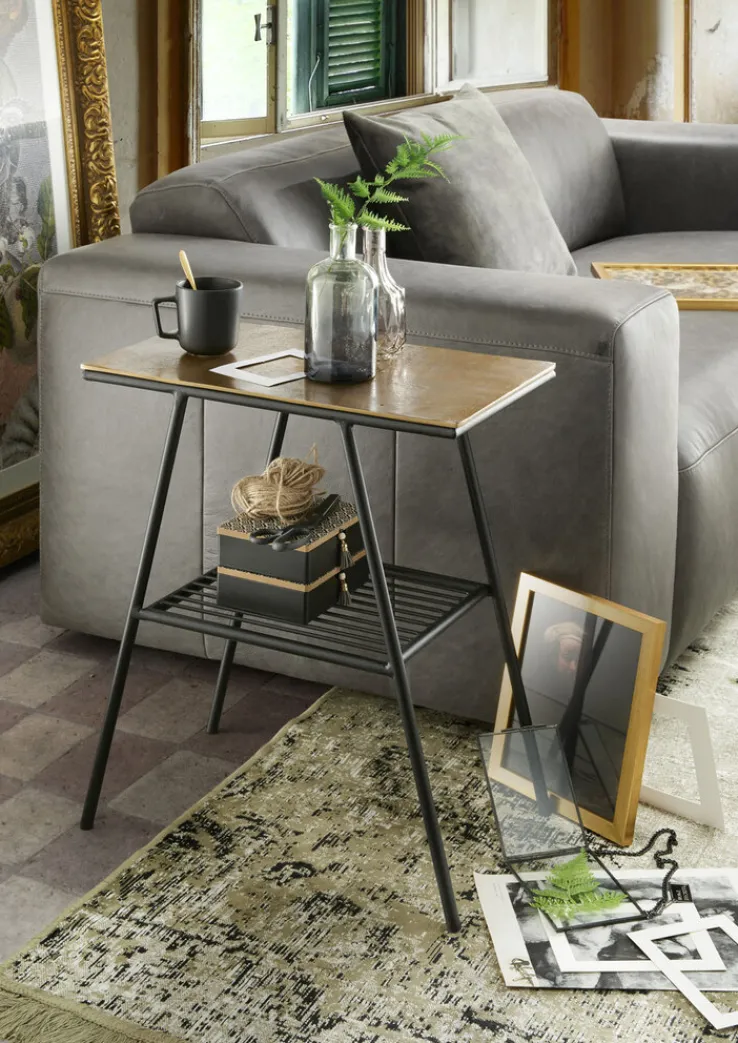 Das Gestell des Beistelltischs VICTORY ist aus mattem, schwarzem Aluminium gefertigt und bekommt durch die trapezförmig angeordneten Beine einen dynamischen Look. Auf dem rustikal anmutenden Gitter im unteren Bereich können beispielsweise Aufbewahrungsboxen oder eine kuschelige Wohndecke Platz finden. Die Oberfläche stellt mit ihrem goldfarbigen Glanz das Highlight des Tisches dar. Hier empfiehlt sich eine sparsame Dekoration mit transparenten Vasen oder Schalen, aktuellem Lesestoff oder einem Teller mit Süßigkeiten oder Gebäck.