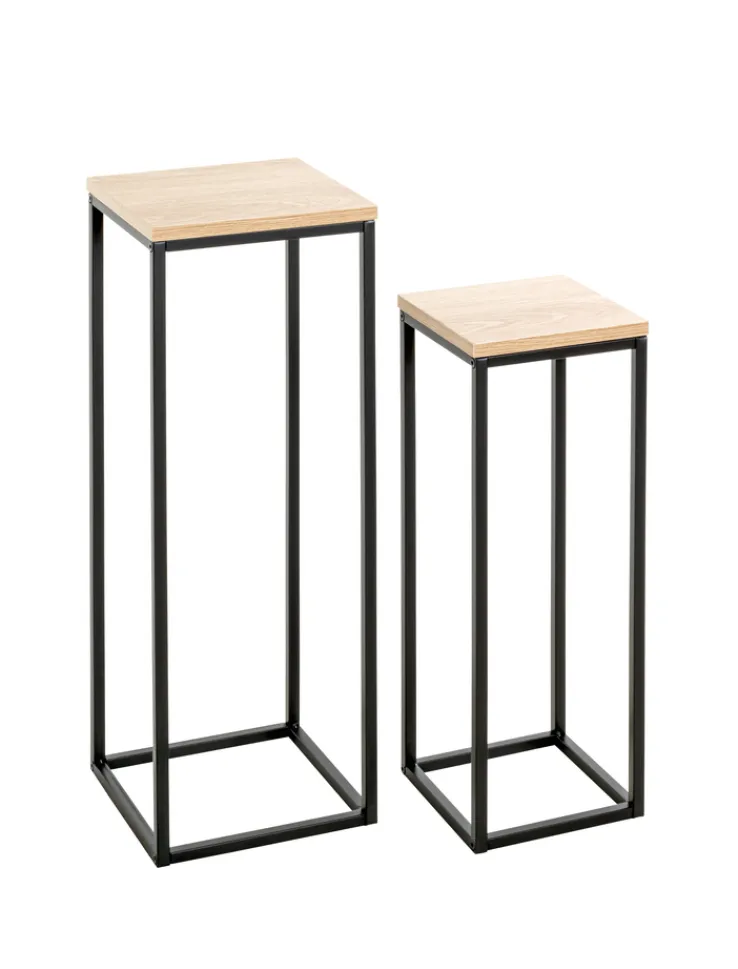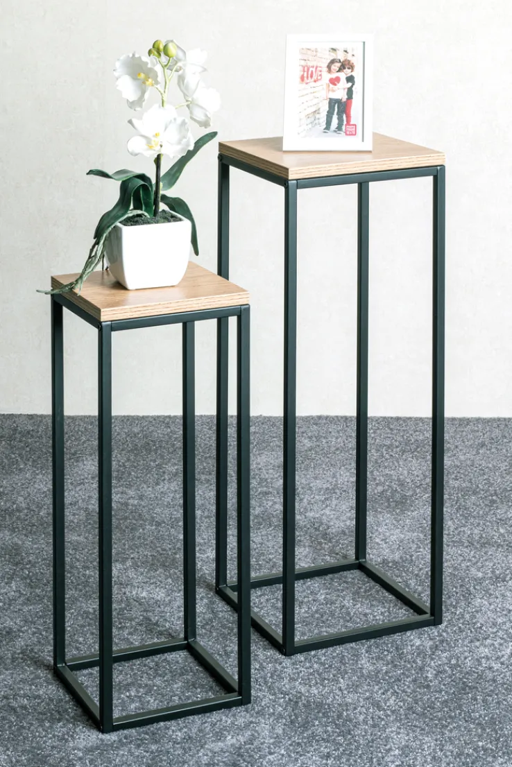 In einem modernen, braun-schwarzen Look zeigt sich das elegante Blumensäulen 2er-Set. Während das Gestell jeweils aus pulverbeschichtetem Metall besteht, punkten die beiden kleinen Tischplatten mit einem aparten Eiche-Dekor.