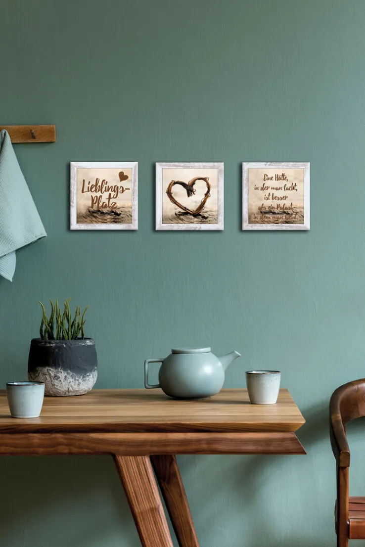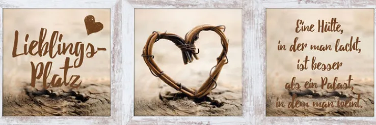 Das Bild LIEBLINGSPLATZ besteht aus einem 3er Set quadratischer Kunstdrucke, die in einem ansprechenden Rahmen angeordnet sind. Die leicht verwaschene Farbgebung der Holznachbildung sorgt für einen trendigen Vintage Look. Das Kunstwerk wird idealerweise am hauseigenen Lieblingsplatz aufgehängt. So wissen auch Besucher gleich, wo sie willkommen sind.
