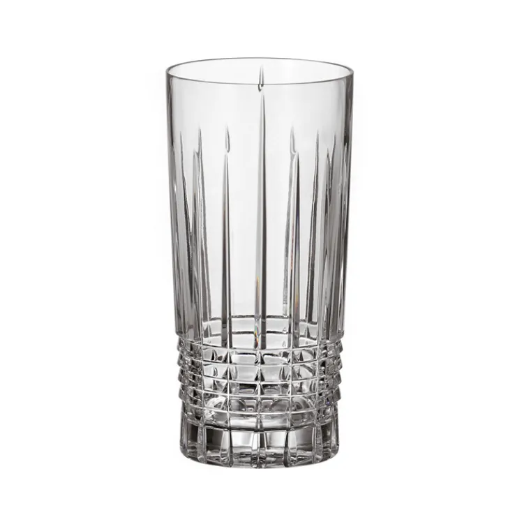 Das Longdrinkglas der Serie SYDNEY zeichnet sich durch seine klare, transparente Optik aus. Es besteht aus hochwertigem Kristallglas und verfügt über ein Fassungsvermögen von 330 ml bei einer Höhe von 15 cm und einem Gewicht von 0,47 kg. Das Glas präsentiert sich mit einem geradlinigen, zylindrischen Design. Die Oberfläche ist durch vertikale Facettenschliffe geprägt, die dem Glas eine elegante Struktur und einen besonderen Lichtreflex verleihen. Im unteren Bereich sorgt ein zusätzliches, fein gearbeitetes Rautenmuster für Stabilität und eine ansprechende Haptik.
