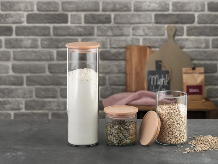 Die Vorratsdose mit einem Fassungsvermögen von 1.800 ml besteht aus transparentem Borosilikatglas und misst 30 cm in der Höhe. Das Glas ist klar und glatt, die Zylinderform sorgt für eine moderne, schlichte Optik. Der Deckel ist braun und scheint aus Holz gefertigt zu sein, wodurch er einen natürlichen Akzent setzt. Das Produkt ist besonders für die Aufbewahrung von Lebensmitteln in der Küche geeignet und bietet durch das verwendete Borosilikatglas eine hohe Beständigkeit gegenüber Temperaturschwankungen. Das Gesamtgewicht beträgt 0,50 kg. Die klare Gestaltung erleichtert das Erkennen des Inhalts und unterstützt eine ordentliche Lagerung.