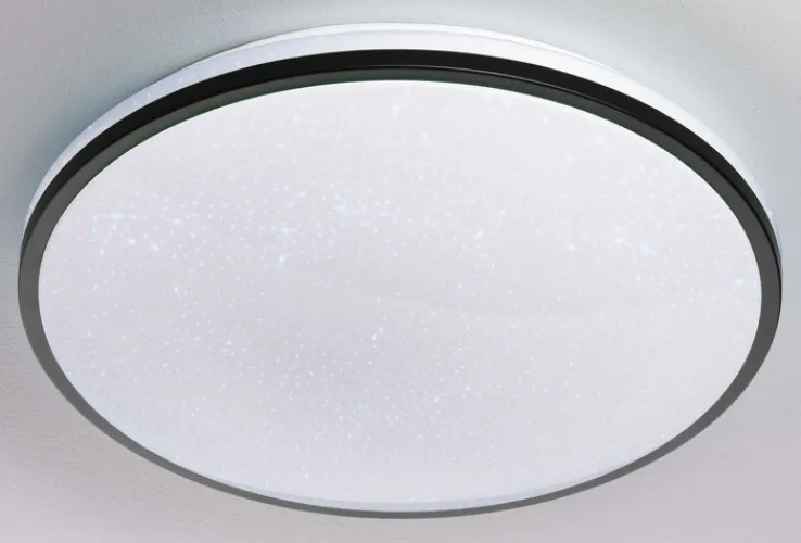 Ob im Schlaf- oder Kinderzimmer: Die runde LED Deckenlampe von casaNOVA ist dank ihres stimmungsvollen Sternenhimmel-Effekts überall eine gute Idee, wo geruhsame Nächte verbracht werden sollen. Tagsüber hält sie sich mit ihrem denkbar einfach gehaltenen Design optisch eher im Hintergrund. Mithilfe der Fernbedienung lässt sich die schwarz-weiße Lampe unkompliziert dimmen. Darüber hinaus ist es mit ihr auch kein Problem, die optimale Lichtfarbe einzustellen. Eine praktische Memory- sowie eine Nachtlicht-Funktion stehen ebenso zur Verfügung.