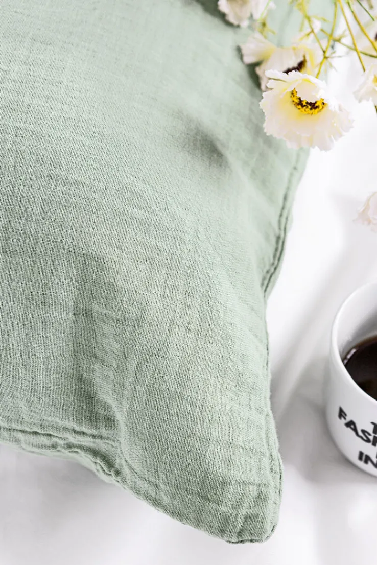 Aus 100 Prozent Baumwolle gefertigt und mit Knöpfen ausgestattet, ist die unifarbene Musselin-Kissenhülle GRETA in Salbeigrün von casaNOVA bei bis zu 40 Grad Celsius in der Maschine waschbar. Die Kissenhülle hat die Maße 45 x 45 Zentimeter.