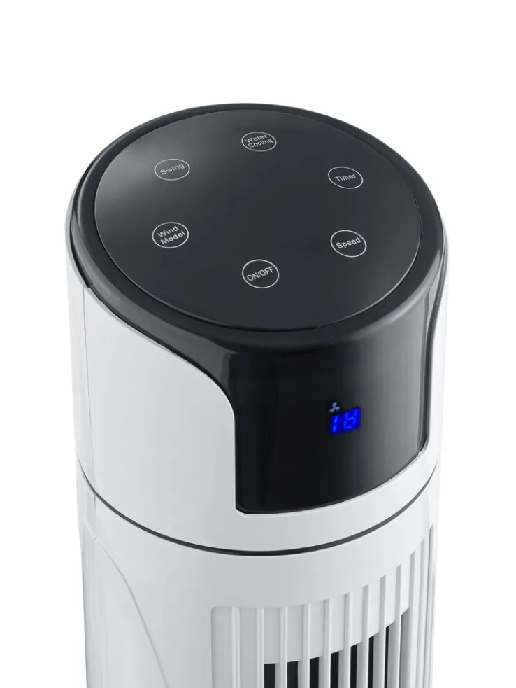 Der schwenkbare Turmventilator COLOMBO vom Hersteller casaNOVA sorgt bei Sommerwetter für einen angenehmen Luftstrom in Wohnräumen und Büros. Die gewünschte Geschwindigkeitsstufe lässt sich direkt über das auf dem Turm befindliche Touchdisplay oder bequem vom Sofa aus mit der Fernbedienung auswählen. Die kühlende Wirkung kann mit Wasser, das über einen Tank aufzufüllen ist, verstärkt werden. Das CE-geprüfte Gerät verfügt außerdem über einen Timer, sodass ein zeitgesteuerter Betrieb möglich ist.
