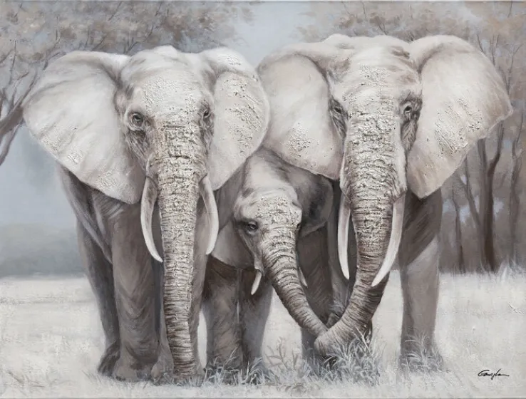 Das Bild „ELEFANTEN I“ von Casanova ist ein beeindruckendes Kunstwerk auf Leinwand, das die majestätische Präsenz von drei Elefanten in einer natürlichen Umgebung darstellt. Die Hauptfarben des Bildes sind in sanften, erdigen Tönen gehalten, die eine beruhigende und harmonische Atmosphäre schaffen. Die detaillierte Darstellung der Elefanten, insbesondere ihrer Hautstruktur und der imposanten Stoßzähne, verleiht dem Bild eine realistische und zugleich künstlerische Note.