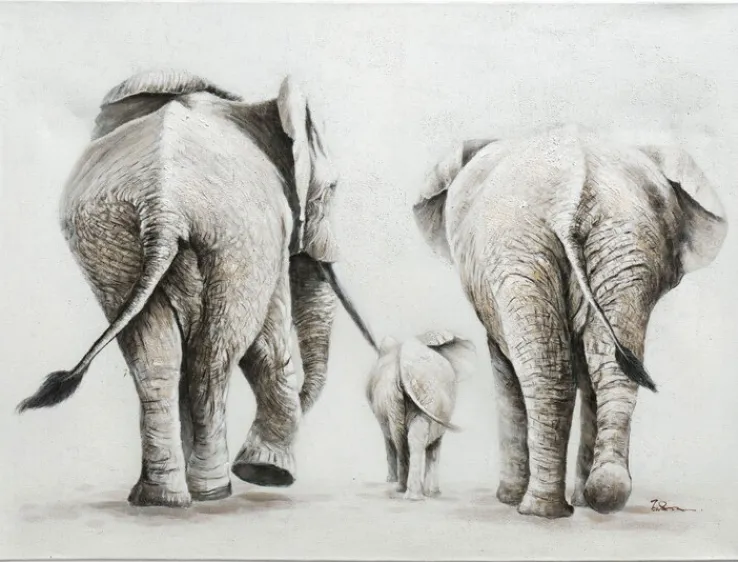 Das Bild „ELEFANTEN II“ auf Leinwand zeigt eine eindrucksvolle Darstellung von drei Elefanten, die in einer natürlichen Umgebung von hinten zu sehen sind. Die Hauptfarben des Bildes sind in sanften, erdigen Tönen gehalten, die die majestätische Präsenz der Elefanten unterstreichen. Die Textur der Leinwand verleiht dem Bild eine zusätzliche Dimension und hebt die feinen Details der Elefantenhaut hervor. Mit einer Breite von 120 cm und einer Höhe von 90 cm ist das Bild ein auffälliges Dekorationsstück für jeden Raum.