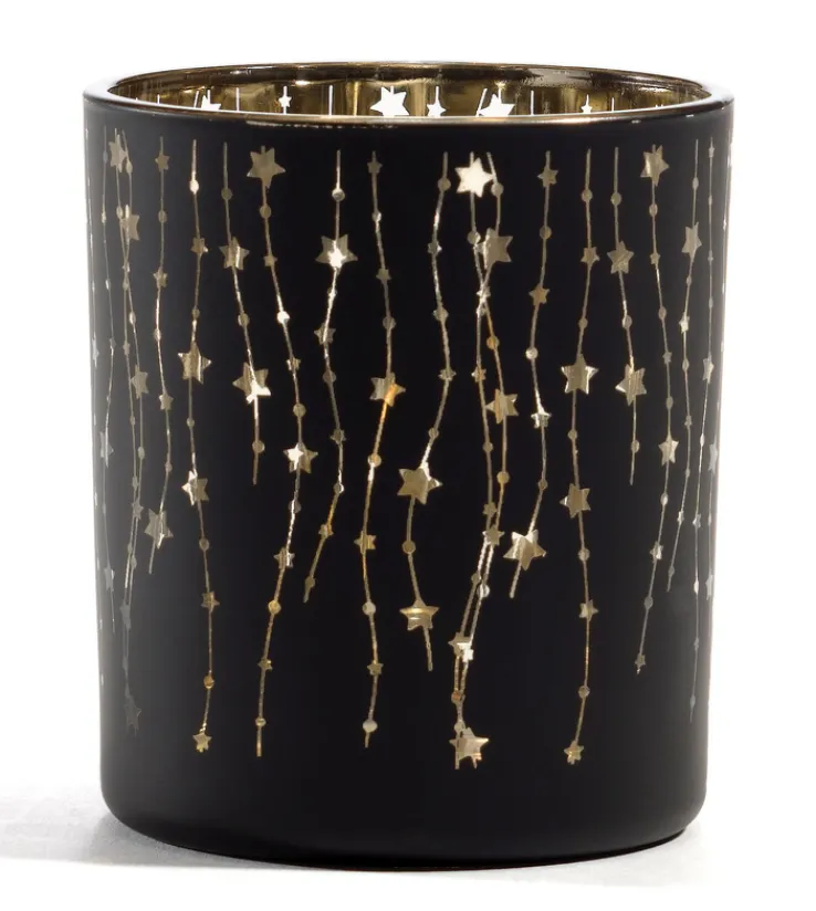 Bei einer Höhe von 7,7 cm und einem Durchmesser von 6,8 cm ist der feine Teelichthalter einfach ideal für eine elegante Tischdeko oder wenn man es sich einfach auch nur gemütlich machen möchte. Schließlich passt das schöne Gefäß nicht nur in die Weihnachtszeit. Außen mattschwarz gearbeitet, ist es auf der Innenseite goldfarbig lackiert. Für den besonderen Lichteffekt sind Sterne, die an Schnüren hängen, in die Lackierungen eingearbeitet. Sie erlauben dem Licht des gewählten Teelichtes hindurchzuschimmern. Dadurch entstehen zauberhafte und verträumte Lichteffekte. So schön kann ein moderner, festlicher Teelichthalter sein.