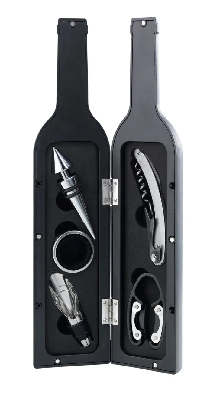 Ebenso sind ein praktischer Weinausgießer und Tropfenfänger enthalten. Auf diese Weise bleibt auch das Tischtuch sauber. Zu guter Letzt verfügt das Set über einen Folienschneider, um die Hülle um einen Korken zu durchtrennen. Ein tolles Geschenk für Weinliebhaber!