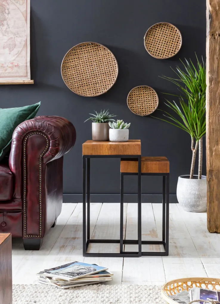 Die Kufengestelle bestehen aus schwarzem Metall, die Tischplatten sind aus massivem, braunem Holz gearbeitet. Die Tische lassen sich einzeln an verschiedenen Orten aufstellen, sie sehen aber auch attraktiv aus, wenn der größere den kleineren ein klein wenig überlappt und sie so zusammen platziert werden. Dabei fällt die lebhafte Maserung auf. Die Möbel passen in moderne Wohnungen, die mit Holz und Metall eingerichtet sind.