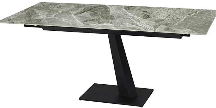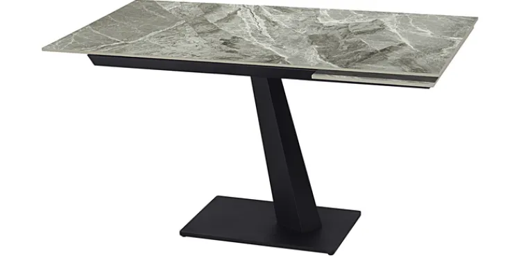 Der Esstisch NENA besticht mit seinem eleganten Look mit einer hellgrau marmorierten Tischplatte aus gesintertem Stein. Die Platte wird von einem schwarzen Säulengestell aus Metall mit einer rechteckigen Bodenplatte getragen. Der Tisch misst 85 cm in der Breite, 76 cm in der Höhe und 140 cm in der Länge. Er lässt sich mit Hilfe des Kopfkulissenauszugs auf 180 cm ausziehen. So bietet er bequem Platz für vier bis sechs Personen.