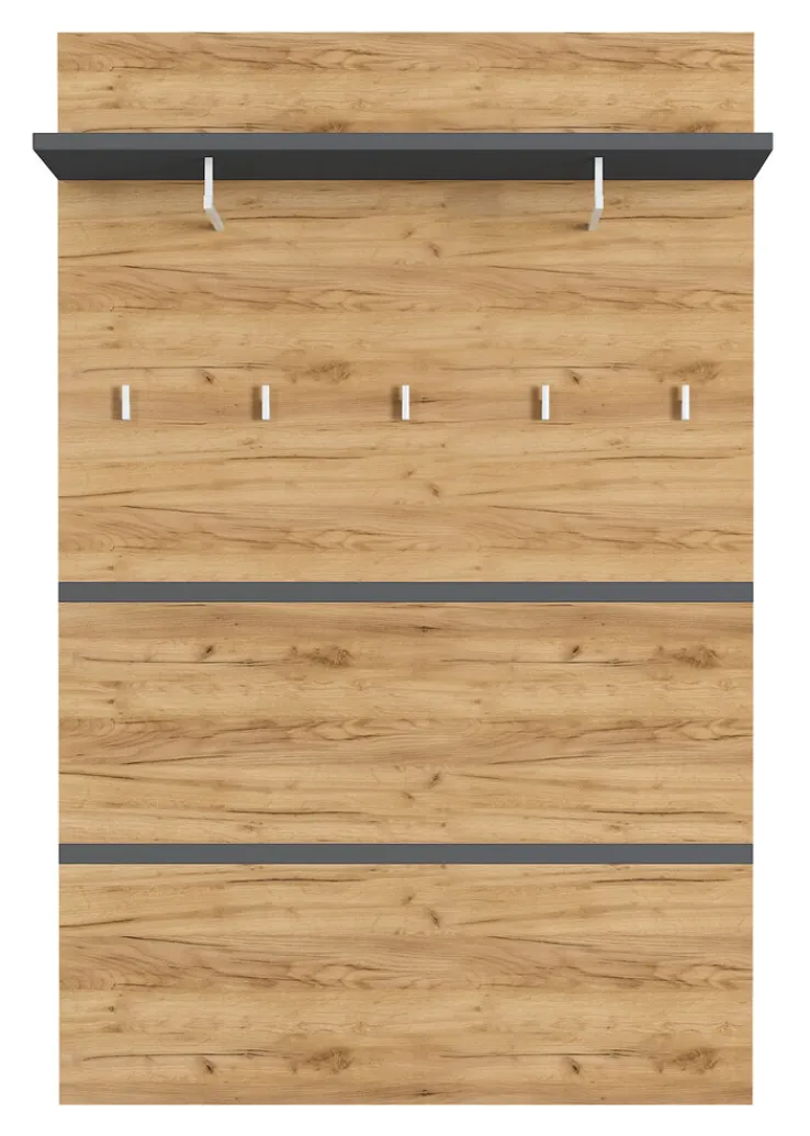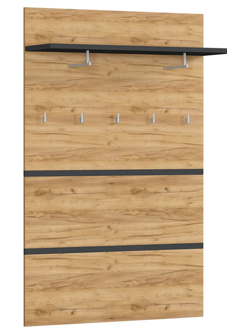 Gefertigt ist das Garderobenpaneel von CASAVANTI aus einer Holznachbildung in Eiche Navarra-Dekor. Anthrazitgraue Absetzungen bilden einen dekorativen Kontrast. Die silberfarbigen Haken und Stangen machen seine Optik komplett. Der Ablageboden des CASAVANTI Garderobenpaneels kann mit einem Gewicht von bis zu 10 kg belastet werden. Jacken, Mäntel, Taschen und Kopfbedeckungen können platzsparend und ordentlich an dem Möbelstück aufgehängt werden, bis sie wieder benötigt werden. Neben einem modern eingerichteten Flur kann der Einrichtungsgegenstand auch im Ankleidezimmer verwendet werden.