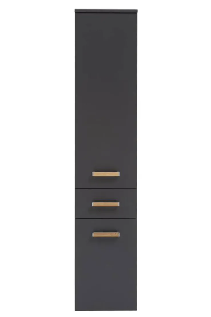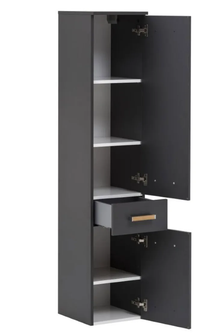 Die Seitenteile, die Rückseiten, die Fachböden und die Fronten sind aus stabiler Spanplatte gefertigt. Der Korpus und die Fronten sind mit Melaminharz im Dekor Anthrazit beschichtet. Die Rückseite und die individuell verstellbaren Fachböden sind weiß lackiert. Die Bügelgriffe der Türen und der Schublade haben eine tolle Eichen-Optik. Die Scharniere der Drehtüren sind mit einer Soft-Close-Funktion ausgestattet.