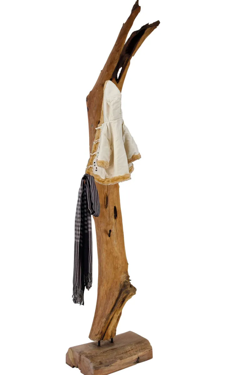 Jedes Stück ist ein Unikat, denn Teak ist ein Naturmaterial, bei dem kein Teil dem anderen gleicht. Der Kleiderständer sollte einen besonderen Standort erhalten, beispielsweise gleich am Anfang eines langen Flurs. Dort fällt er ins Auge und begeistert Ihre Gäste. Auch Sie selbst werden sich jeden Tag an der ausgefallenen Form erfreuen. Der Baumstamm ist in seiner Form nicht gerade, sondern leicht gebogen und am oberen Ende gespalten. Der Sockel, auf dem er befestigt ist, besteht ebenfalls aus Teak. Das attraktive Möbelstück besitzt in seiner Gesamtheit einen sicheren Stand.