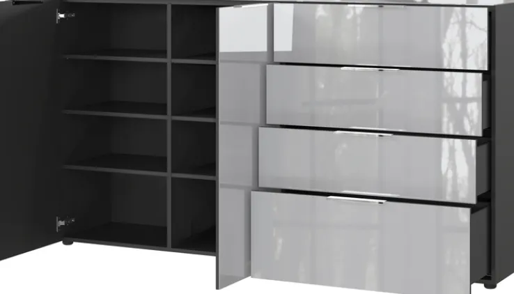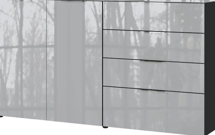 Das hochwertige Sideboard OAKLAND hat die Maße 184 x 102 cm und passt in moderne Einrichtungen. Durch die Fronten und Auflagen aus echtem Glas ist das 2-türige Sideboard in den Farben graphit/silbergrau ein Blickfang im geschmackvoll eingerichteten Eingangsbereich. Hinter den Drehtüren bietet das Sideboard mit sechs Einlegeböden viel zusätzlichen Stauraum. Für Kleinteile und diverse Accessoires stehen vier geräumige Schubkästen zur Verfügung. Das Sideboard schafft eine wohnliche Atmosphäre.