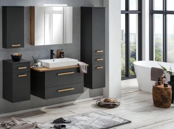 Der Korpus und die Fronten sind aus stabiler Spanplatte. Die Innenseiten der Schränke und Türen sind in der Farbe grau lackiert. Der Korpus ist mit Dekor Eiche und Melaminharz beschichtet und hat dadurch eine attraktive Maserung. Die Fachböden des Spiegelschranks sind aus hochwertigem Sicherheitsglas. Die grifflosen Türen sind verspiegelt. Die Scharniere der Türen sind aus Metall und haben eine Soft-Close-Funktion.