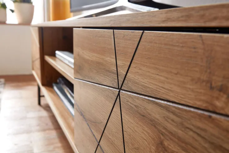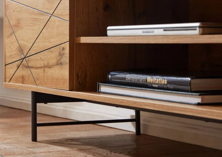 Dieses schicke Board zeigt dunkles Eichendekor in Holznachbildung mit einer starken Maserung. Darauf ziehen sich schmale schwarze Linien hin. In der Mitte werden Geräte platziert, hier finden sich die Kabeldurchlässe. Hinter den Drehtüren haben Technikutensilien, Anleitungen, die Fernbedienung oder CDs Platz. Auf seinen schmalen, pulverbeschichteten Eisenfüßen scheint der Korpus fast zu schweben. Das Möbel ist dennoch robust und trägt problemlos 25 kg.