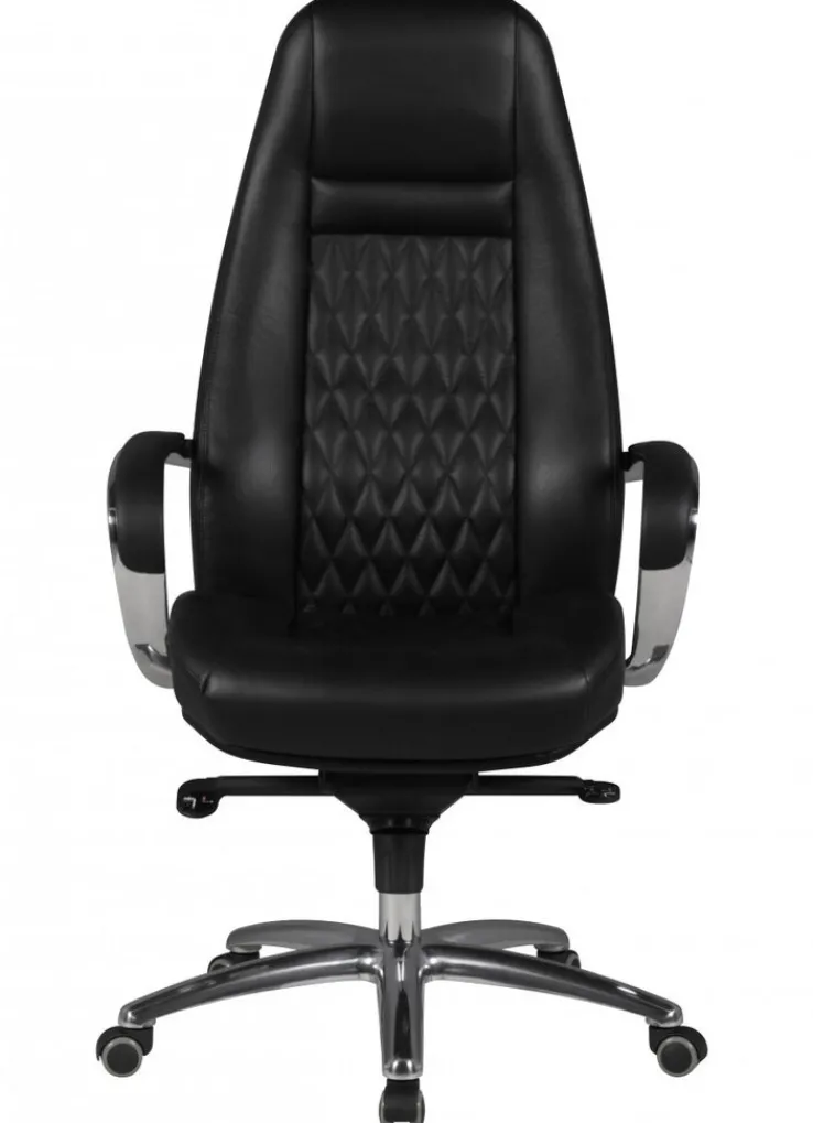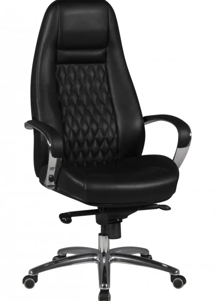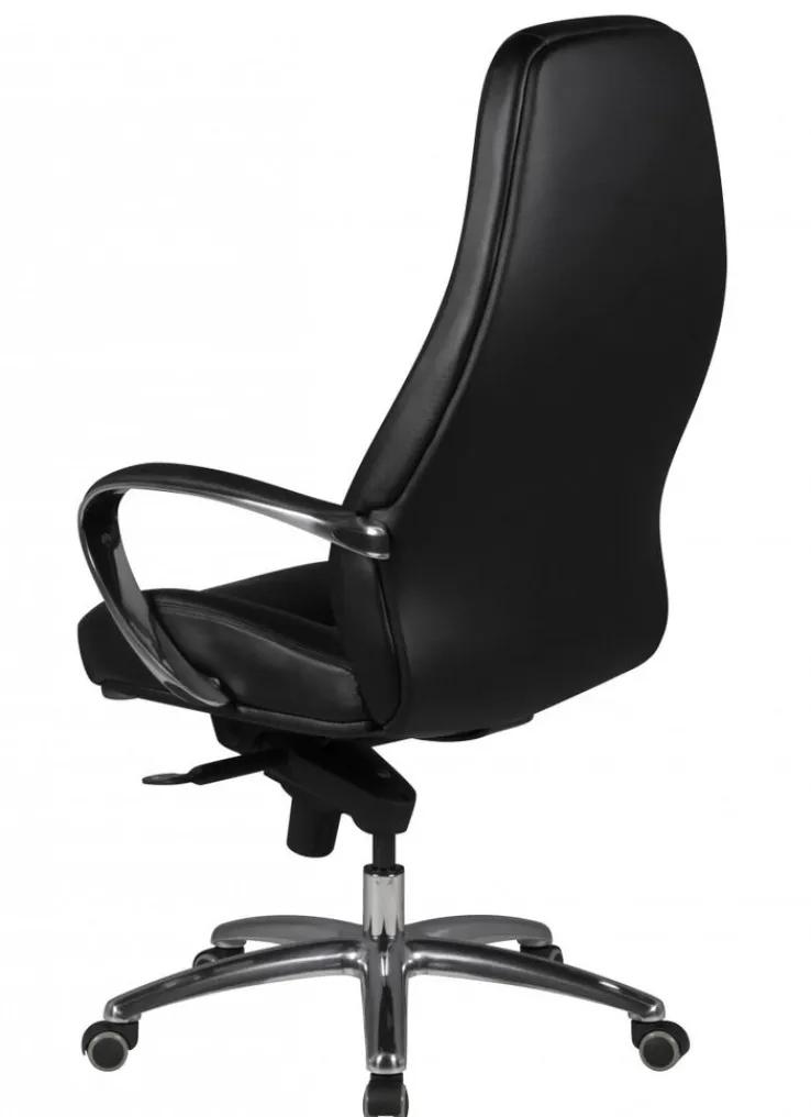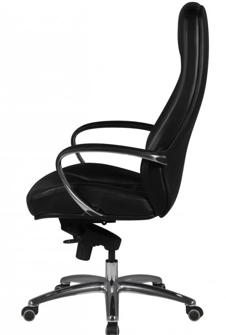 Der Chefsessel AUSTIN misst 68 x 130 x 70 cm. Seine Sitzhöhe lässt sich von 48 cm auf maximal 58 cm erhöhen und ist somit perfekt an den Schreibtisch anpassbar. Die Kombination aus poliertem, silberfarbigem Fußkreuz und schwarzem Leder verleiht dem Schreibtischsessel eine elegante Optik. Für einen hochkarätigen Sitzkomfort sorgen die ergonomische Form, die bequeme Polsterung und die gepolsterten Armlehnen. Darüber hinaus ist die Rückenlehne per Synchronmechanik verstellbar und sorgt zwischendurch für Entspannung.