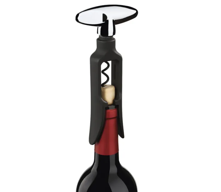 Dieser schicke Korkenzieher wird mit der Spitze auf dem Korken aufgesetzt. Die beiden stabilen Seitenlaschen setzen auf dabei auf dem Flaschenhals auf. Dann wird der Korkenzieher mithilfe des Griffes in den Korken eingedreht. Schließlich wird der Korken wiederum durch den Drehmechanismus herausgezogen, ohne dass man Kraft aufwenden muss. Auf diese Weise werden alle Flaschen auch von unerfahrenen Personen problemlos und sicher geöffnet.