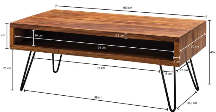 Der Couchtisch misst 100 x 50 cm bei einer Höhe von 40 cm. Er ist aus Sheesham massiv, hat ein offenes Fach und ein schwarzes, pulverbeschichtetes Fußgestell aus Metall.
