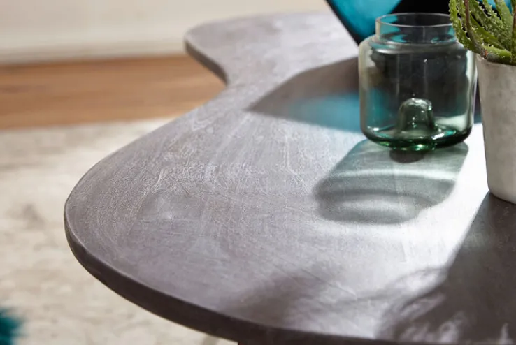 Mit seiner sanft gerundeten Massivholzplatte aus Akazienholz sorgt der Couchtisch für eine lebendige Wohnatmosphäre. Beim gemütlichen TV-Abend lassen sich Snacks, Getränke und Co. griffbereit auf der Tischplatte unterbringen. Mit einer Länge von 122 cm und einer Breite von 45-63 cm bietet der Tisch in Nierenform ebenfalls ausreichend Platz für dekorative Accessoires wie formschöne Vasen oder edles Kunsthandwerk. Für einen sicheren Stand verfügt der in Handarbeit hergestellte Tisch über ausgestellte Füße, die sich farblich von der Tischplatte abheben.