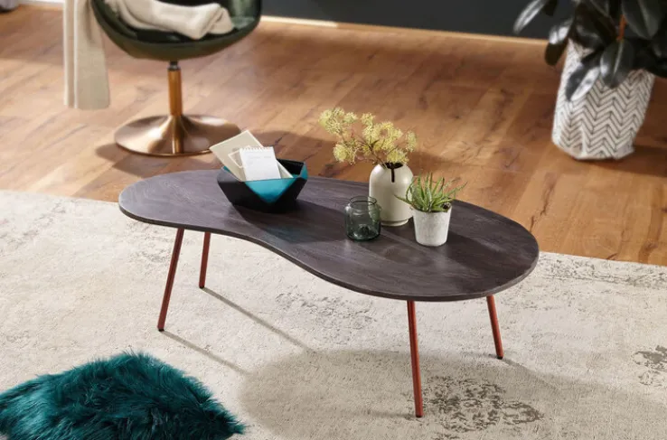 Mit dem nierenförmigen Couchtisch zieht ein absoluter Design-Liebling im Wohnzimmer ein. Der 122 x 63 cm große Tisch zeigt sich mit elegant geschwungener Tischplatte in Grau und einem kupferfarbigen Untergestell.